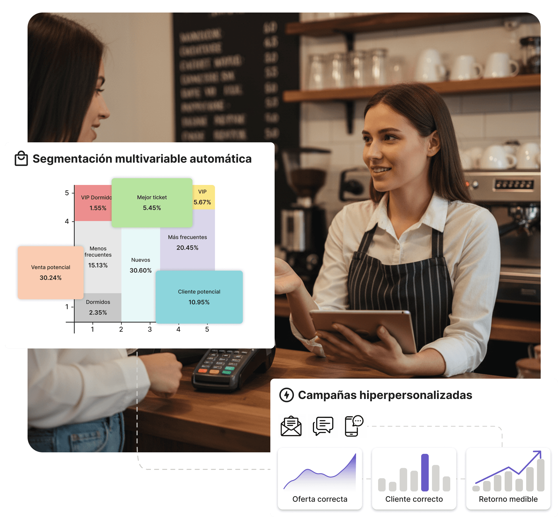 Envía la oferta correcta, al cliente correcto, en el momento correcto. Sin spam. Sin descuentos desperdiciados. Cada comunicación tiene un objetivo de retorno medible.